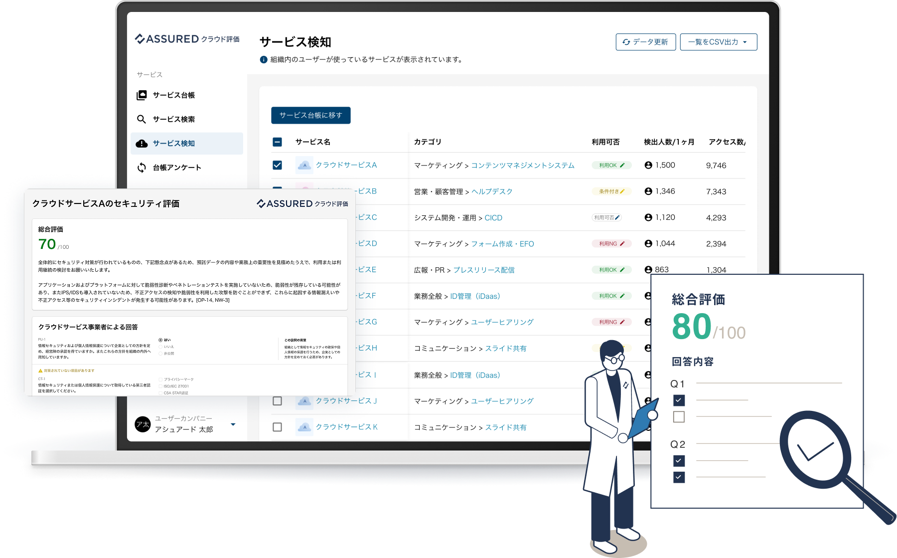 Assuredクラウド評価は第三者機関として、セキュリティのプロたちが年間数千件のサービス評価を実施。そのノウハウから導き出された3つのレポートの情報を集約・還元することで、評価の質を向上。