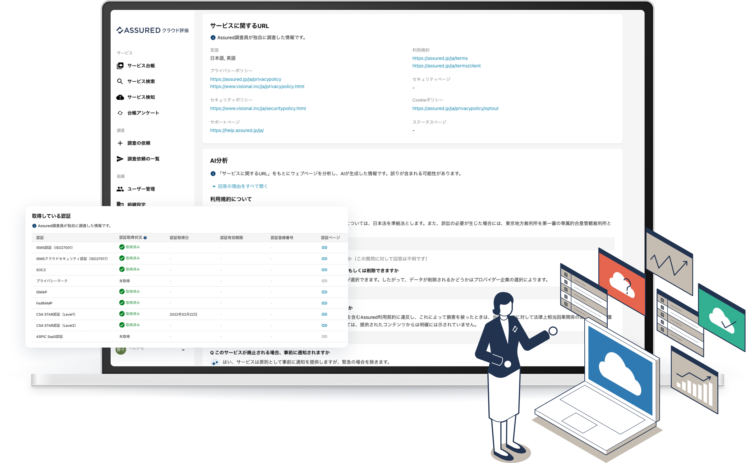 取得している認証のセクションでは、Assuredが収集したクラウドサービスや事業者に関する認証の取得情報を表示。