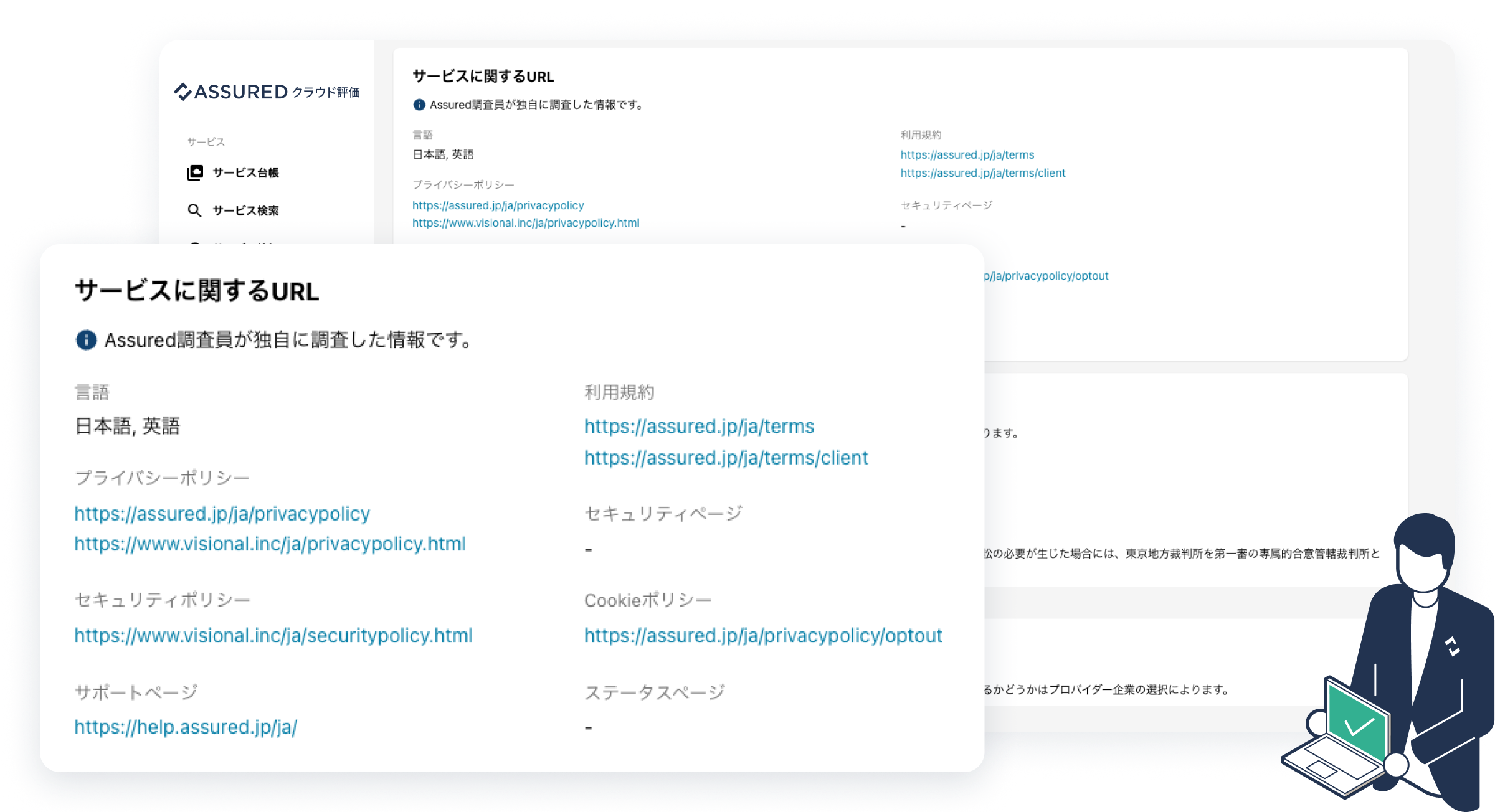 Web上の公開情報を自動収集し、認証情報の確認や、利用規約・プライバシーポリシーなどの分析を実施。