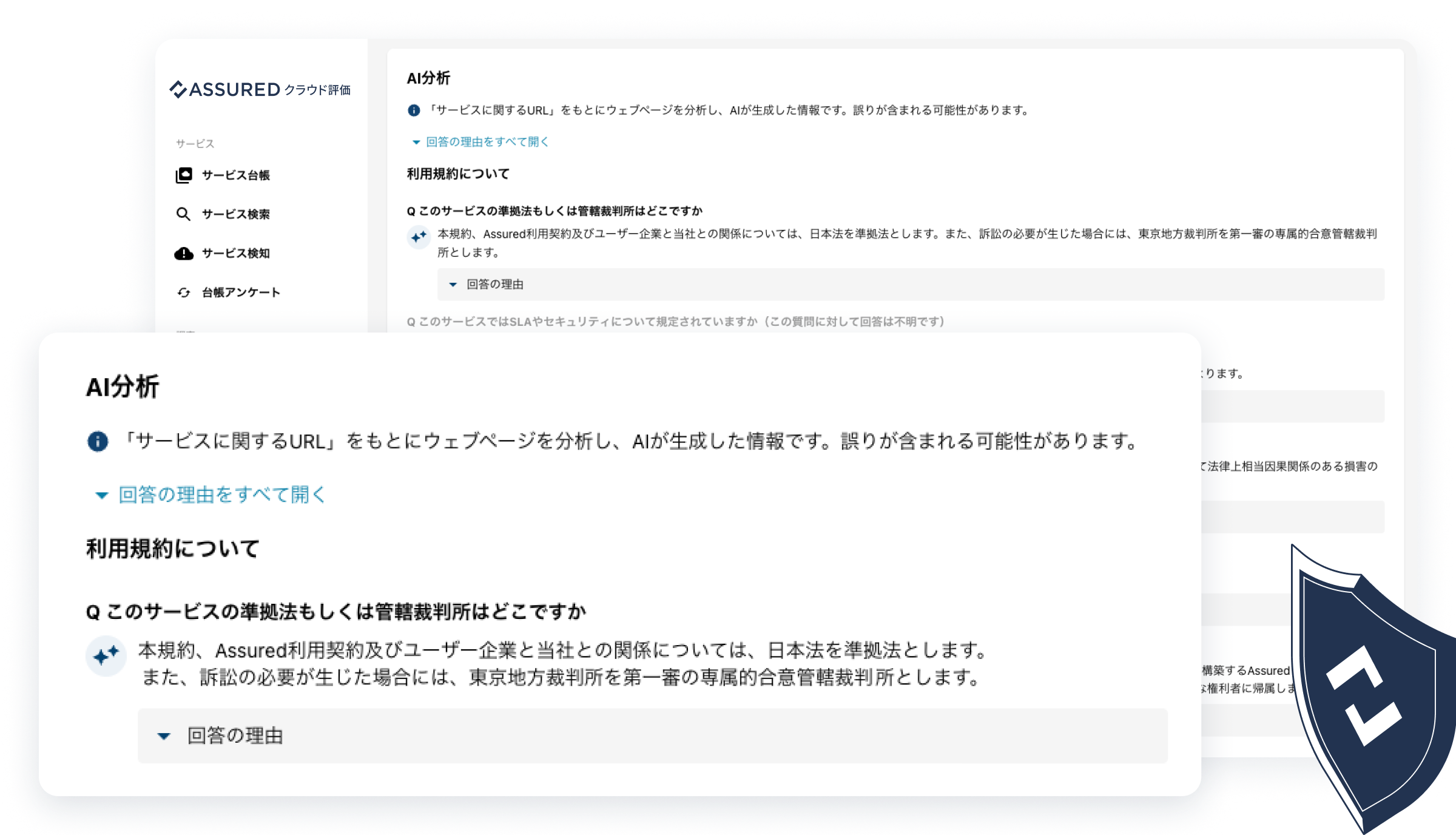 AIが分析した利用規約・プライバシーポリシーに関する質問への回答を表示します。