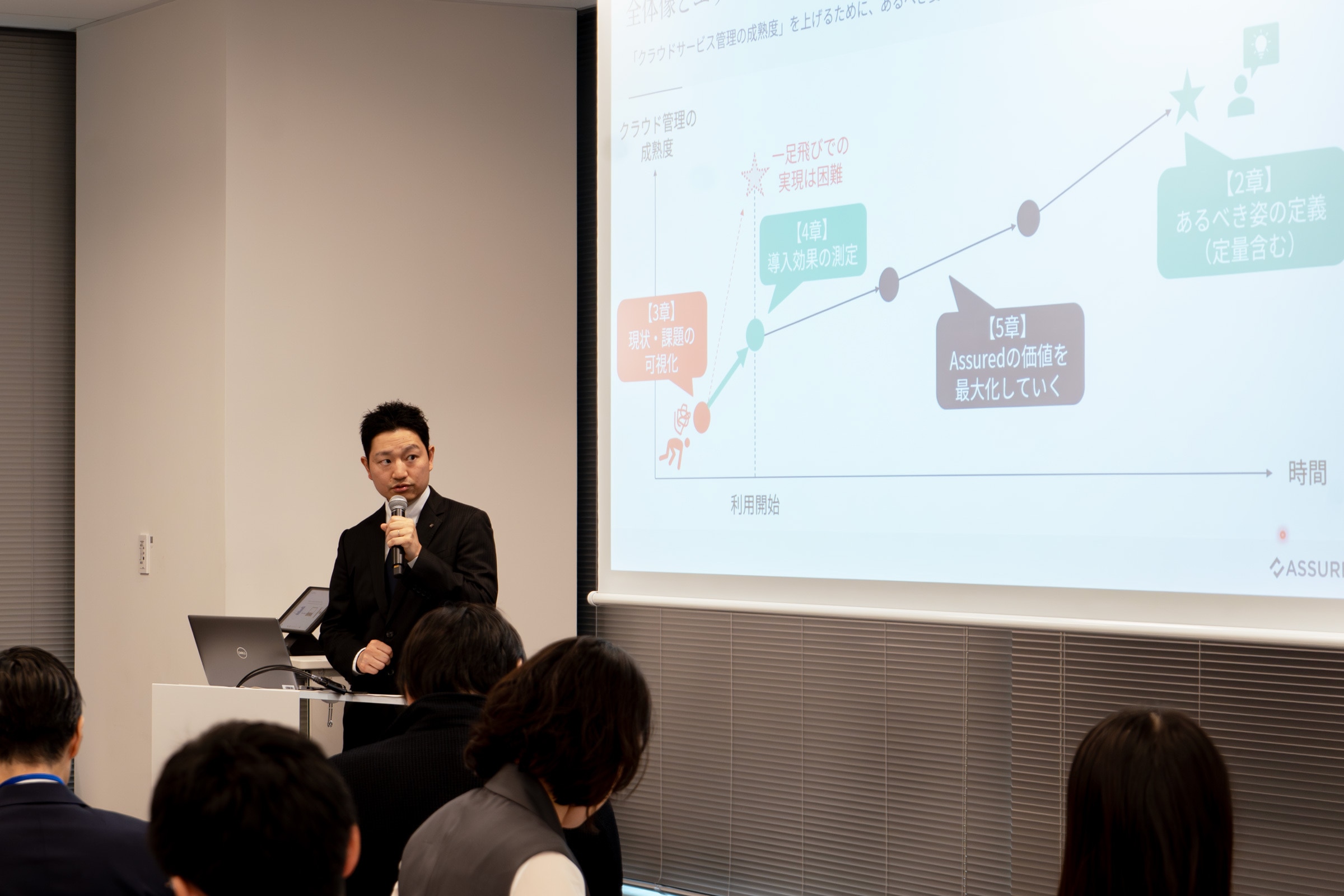 「何から手をつけるべきか」という悩みに対し、植木はAssuredが独自で定義する「クラウドサービス管理の成熟度モデル(全28項目)」を提示。 体制・プロセス・評価手法など、自社の現状を客観的にスコアリングし、リソースに合わせて段階的にレベルアップしていくロードマップの重要性を説きました。