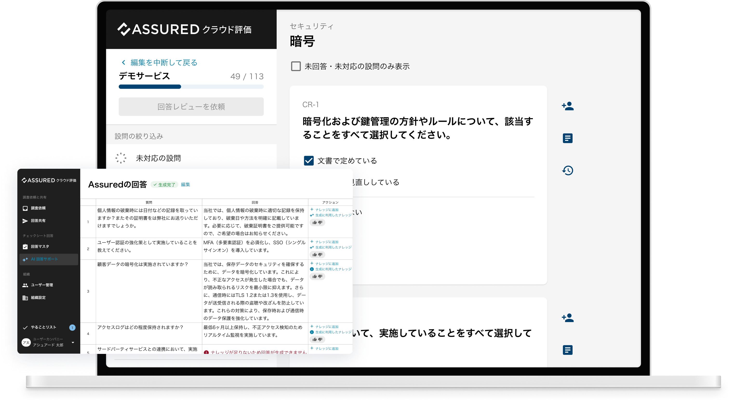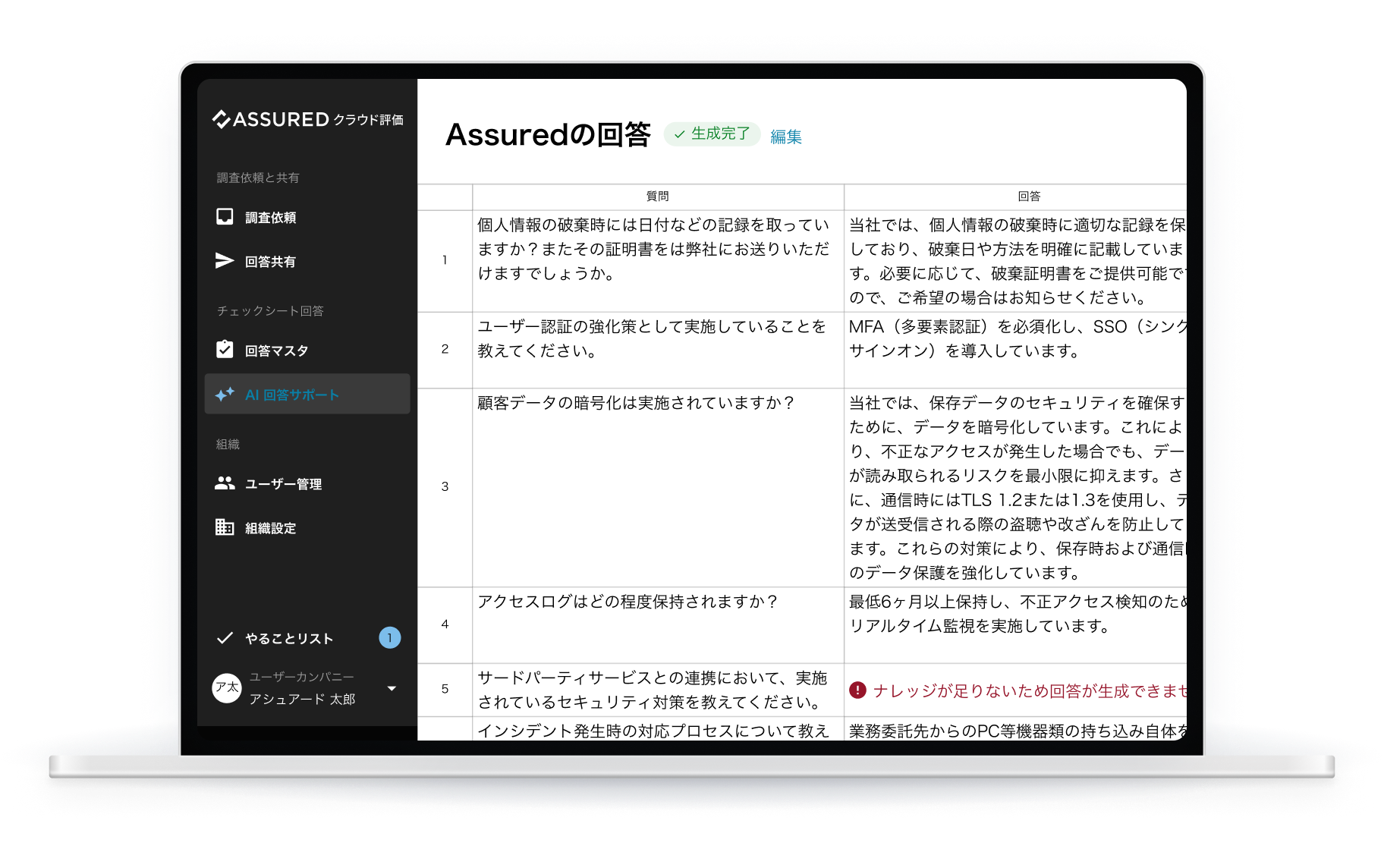 Assuredクラウド評価のオリジナル項目だけでなく、個社別のセキュリティチェックシートを受け取った時も、AIを用いて過去のナレッジから回答サジェストを得られます。