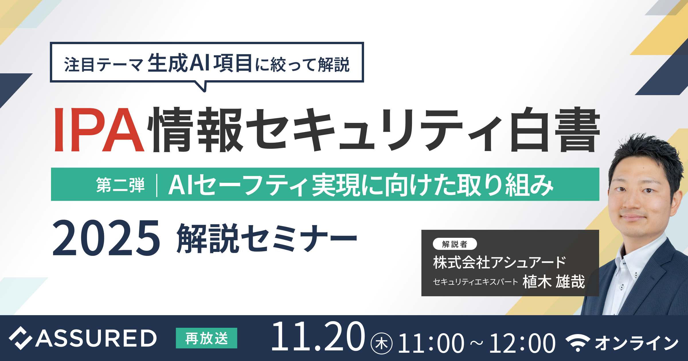 本セミナーでは、この「情報セキュリティ白書2025」で報告されたAIセーフティに関する最新動向を分かりやすく解説します。さらに、4,000以上のクラウドサービス評価データを有するAssuredの独自調査に基づき、多くのサービスにおけるAI利用の実態と、それに伴い見過ごされがちな新たなガバナンス上の課題を明らかにします。