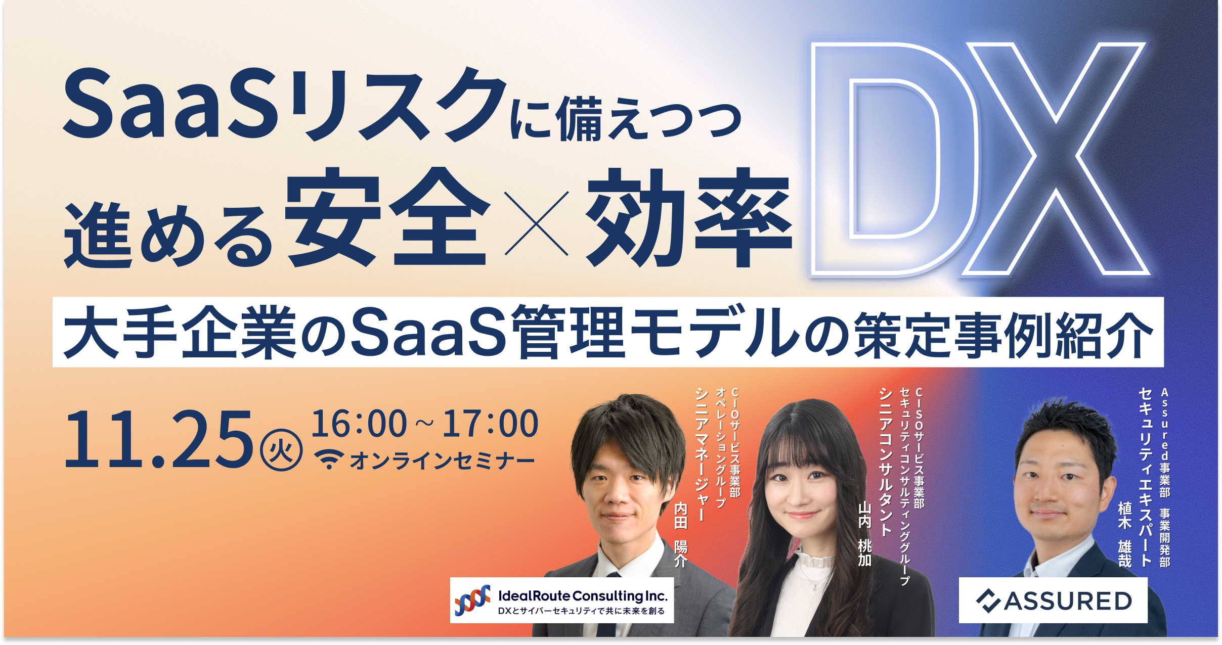 本セミナーでは、DXとサイバーセキュリティ領域で高い専門性を持つアイディルートコンサルティングと、10,000件以上のクラウドサービスセキュリティ評価実績を持つアシュアードが、大手企業が直面するSaaSガバナンスの課題解決法について、事例を交えながら解説します。