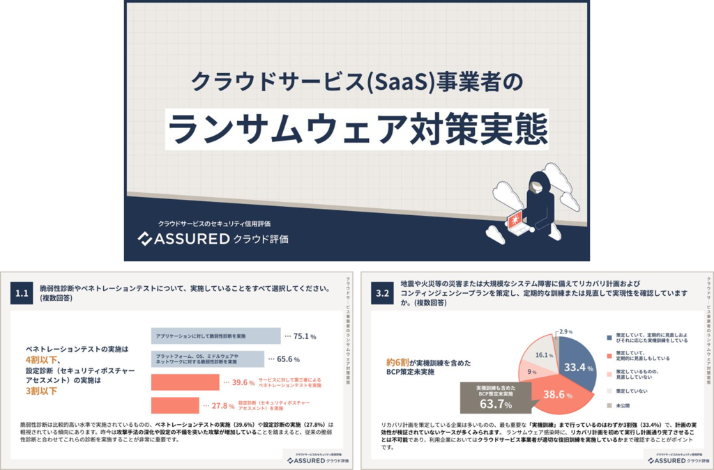 本レポートは、Assuredが実施した約3,900件のセキュリティ評価データに基づき、クラウドサービス事業者のランサムウェア対策実態を「予防」「検知」「復旧」等の観点から定量的に可視化したものです 。本調査結果を通じて、利用企業がクラウドサービスを選定・管理する際に見落とされがちなリスクや、確認すべき評価ポイントを明確化することを目的としています。